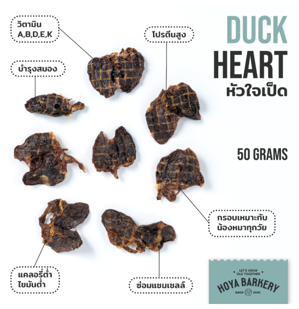หัวใจเป็ดเป็นอวัยวะที่มีวิตามินและสารอาหารมากที่สุดอวัยวะหนึ่ง อบแห้ง 24 ชั่วโมง จนกรอบ ให้เป็นขนมหรือเป็นรางวัลให้น้องหมาได้โดยไม่ต้องกลัวว่าจะเสียสุขภาพ