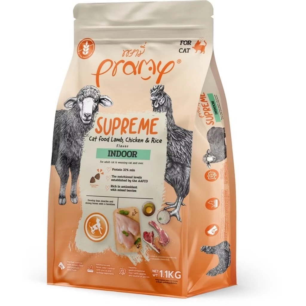 Pramy Supreme Indoor Cat Lamb Chicken & Rice Flavor – อาหารเม็ดสำหรับแมวเลี้ยงในบ้าน สูตรแกะ ไก่และข้าว 1.1kg